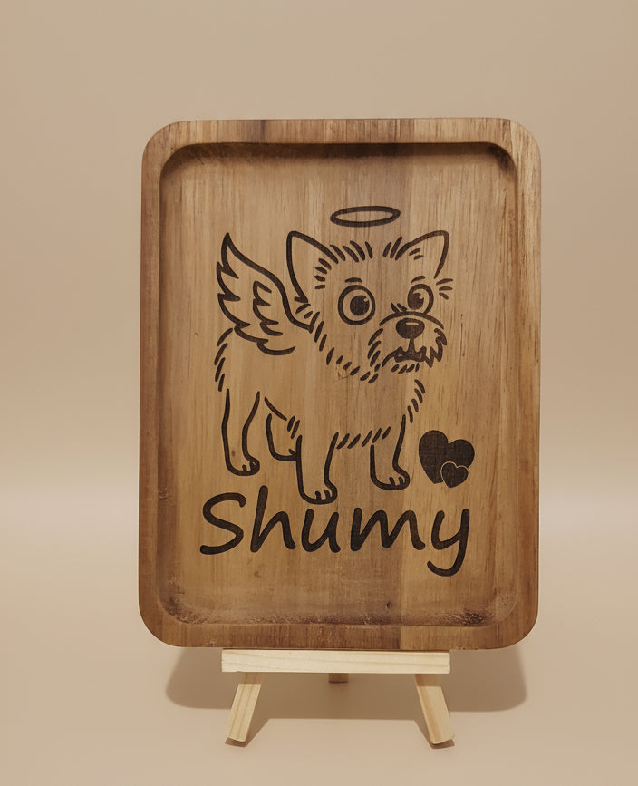 Ce plateau en bois est bien plus qu’un objet : c’est un hommage. Une trace gravée de l’amour partagé avec un compagnon qui a marqué une vie. À partir de votre photo, je grave son portrait avec tendresse, pour que sa présence continue d’habiter votre quotidien.