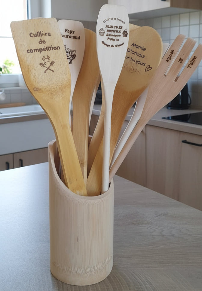 Ces ustensiles en bois gravés sont bien plus que des outils : ce sont des mots d’amour à manier tous les jours.